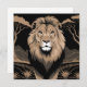 Vintage Lion Portrait, este design apresenta uma ilustração antiga de um retrato de um leão com uma aparência calma e superior. O fundo é uma paisagem safari preto-e-branco com árvores e montanhas. A imagem global tem um estilo de deco de arte.