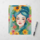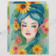 Este design vibrante e caprichoso apresenta um retrato abstrato de uma mulher com cabelo azul lacrimejado com flores coloridas. Sua expressão serena é acentuada por olhos fechados e lábios vermelhos, dando a ela uma aparência de sonho. Ao redor dela estão girassóis vibrantes, flores cor-de-rosa, e uma variedade de folhagem verde, criando uma atmosfera exuberante, semelhante a jardim. A peça tem um estilo de interface suave e vetorial, dando-lhe um sentimento moderno, mas romântico. A paleta de cores é dominada por chaleiras, amarelos, pinças e verdes, criando uma composição harmoniosa e atraente para os olhos.