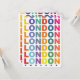 Retro London England poster com texto colorido.