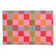This pillowcase has a mid-century modern design of red, pink, and orange squares and green and blue lines forming a plaid design.