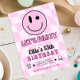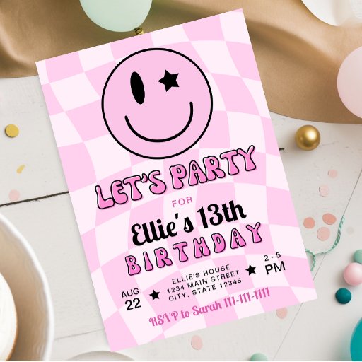 Volte a tempo para o Ano 2000 com o nosso Convite de Aniversário de Rosto Feliz e Rosa! Este convite divertido e nostálgico apresenta um fundo cor-de-rosa com verificação que define a vibração retrorreflectora perfeita. A peça central é uma linda face feliz que pisca e que adiciona um toque lúgubre à design. Ao redor da face feliz estão estrelas e fontes retrorativas que completam a aparência. Personalize os detalhes para torná-lo exclusivamente seu e defina o tom para celebrar o cheio de boas vibrações!