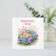 This heartwarming watercolor design features a retro two-tone pickup truck in teal blue and soft purple, driving away into a sunny spring day. The truck bed is overflowing with giant, colorful Easter eggs and blooming pink flowers, capturing the pure joy of the holiday.
