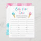 O gênero do tema do sorvete Whimsical revela o cartão de "baby name game" do partido com ilustração aquosa de sorvetes cor-de-rosa e azuis em cones de waffle. Os textos são editáveis. Um jogo perfeito para jogar durante o chá. aos hóspedes para anotar nomes de bebês que começam com cada alfabeto. Quem termina todos os alfabetos primeiro ganha!
