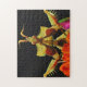 Amantes insetos, entomologistas — e todos os rapazes — aqui está um quebra-cabeça lindo, mas assustador, com uma foto macro de perto de um maníaco de oração com flores coloridas.