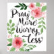 Esta design é um belo lembrete para não se preocupar, mas para confiar em Deus e rezar suas preocupações a Ele! Belo design de caligrafia elegante com palavras a preto, "Reze Mais Preocupada Menos" com rosas de aquarela no canto superior direito e inferior esquerdo sobre fundo branco.