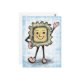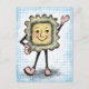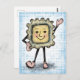 Ricky Ravioli é um personagem ravioli de estilo vintage em amarelo e rosa com um fundo pontilhado azul.