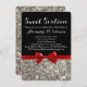 Rich red arco, prata brilhante padrão de fundo impressão e fita com arco, impressa neste adorável, chique e sassy doce convite de aniversário para a garota com um senso de estilo e graça na moda. O brilho de faíscas cintilantes é menos bagunçado que a coisa real, e o belo arco é um toque impresso maravilhoso.