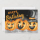 Três abóboras esculpidas rindo trazem seus votos de Feliz Aniversário nesta modelo do Dia das Bruxas. As lanternas saem de uma neblina que cria apenas um pouco de uma vibração assustadora contra o fundo negro. Feliz Aniversário está escrito em uma combinação de fontes de tendência em laranja e amarelo. Seu nome está abaixo. A parte de trás do cartão de aniversário apresenta o mesmo padrão de Halloween e uma saudação de aniversário que você pode personalizar. Na verdade, todo o texto pode ser facilmente personalizado. Enviar um cartão de aniversário é a maneira perfeita de manter contato durante a temporada de outono.