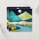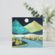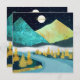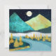 Uma bela paisagem com texturas únicas mostrando um rio e uma paisagem de montanha com lua ascensão e céu estrelado em tons de azul, ouro, verde escuro e amarelo.