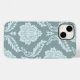 A vintage style decorative damask off-set surface pattern influenced by rococo classical design in duck egg blue color detail on a teal background.