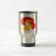 Este design é uma roda do queijo. A roda do queijo tem uma fatia grande cortada dela. Esta roda do design do queijo olha grande nesta caneca de viagem
