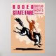 ilustração do estilo retro de uma Poster mostrando um cowboy americano Rodeo andando de um cavalo bronco balbucante saltando de lado com as palavras "Feira do Estado Rodeo 30 de outubro a 5 de novembro juntem-se agora"