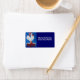 Uma figura de desenho animado de uma galinha ou galo parado em um letreiro vestindo um chapéu vermelho de santa e botas vermelhas, em uma pose cantora enquanto os flocos de neve caem no céu azul atrás. Fácil de personalizar e personalizar como etiqueta, nome de etiqueta ou adesivo de endereço de correspondência.