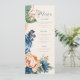 Um floral brilhante e ousado de rosas em tons de azul empoeirado e pêssego é o ponto focal de muitas das peças desse suite de casamento que também contém textos elegantes e layouts modernos de design. O cardápio de casamento mostrado aqui tem uma borda lateral de rosas e uma bela abstrato de aquarela no verso em azul empoeirado. Insira facilmente os detalhes pessoais do menu, a data do casamento, a noiva e as iniciais do noivo usando o modelo fornecido. Procure ID584 para ver todas as peças correspondentes neste belo conjunto de casamento.