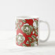 Uma caneca de café elegante com um padrão de rosas gravadas em branco e douradas em vermelho.