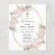 O convite da Primeira Comunhão elegante e feminina apresenta belas rosas cor-de-rosa aninhadas em folhagem verde macia decorando uma estrutura de ouro. As rosas e folhas têm detalhes mais brilhantes para adicionar um toque de brilho. Todo o texto é editável para que você possa usá-lo para qualquer tipo de cerimônia religiosa, Batismo, Cristo, Dedicação ou Confirmação.