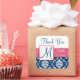 O casamento tema damasco floral do azul marinho e o branco favorece a etiqueta com a cor de acento e a inicial cor-de-rosa do monograma. Design por Elke Clarke©. Gráficos licenciados. Precise uma cor diferente ou ajude-a por favor a contactar luxuryweddinginvitations@gmail.com