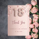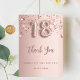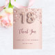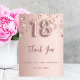 Um cartões de agradecimentos para um aniversário de 18 anos. Uma cor de fundo rosa dourada. Com rosa dourado pingando estrelas brilhantes. Na frente: número 18 escrito com uma fonte no estilo do balão, um grande script com letra rosa dourada escura e o texto: Obrigado, seu texto, título e uma data. Voltar: Personalize e adicione seu nome e nota de agradecimento.