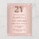 Um convite moderno, na moda e glamouroso para um aniversário de 21 anos. Um fundo metálico rosa dourado falso com um brilho elegante rosa dourado, pintura gota-a-gota. O nome é escrito com um moderno e escuro, rosa dourado, escrito com letra de estilo manuscrito. Personalize e adicione os detalhes da sua festa. O número 21 é escrito com uma fonte de estilo balão, script.
