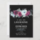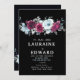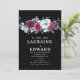Cartão de Convite para Boho Russo Floral Russo Floral Azul-Burgundy, com Burundi-Hidrologia. Perfeito para um casamento outono. A design apresenta um buquê espantoso de flores azuis e arborizadas, marinhos com folhas correspondentes. Simples cartão de convite de casamento design negro fundo negro escuro com flor azul floral moderno na moda de cartão moderno minimalista e preto de tendências