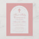 Um convite para a primeira comunhão de uma garota. Em um fundo rosa poeirento (rosa escuro), ele tem um arco branco com dentro de texto rosa empoeirado. As palavras Primeira Comunhão Santa e o nome são escritos num guião caligráfico elegante; a primeira linha é o texto arquivado.