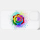 Rosa grande e florescente com pétalas arco-íris sobre fundo branco, pintadas com pedaços de tinta colorida e brilhante. 3d