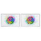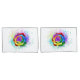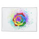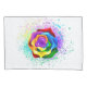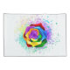 Rosa grande e florescente com pétalas arco-íris sobre fundo branco, pintadas com pedaços de tinta colorida e brilhante. 3d