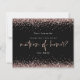 Glitter Rosa Dourado Matron Of Honor Request. Um alternativo de 4,5 pol x 5,6 pol com preço inferior. Disponível em um STOCK DE CARTÃO SEMI-GLOSS 110 lb, que é a opção padrão (mais espesso para convites), OU um STOCK de PAPEL THINNER FINISH 80 lb FINISH (ideal para gabinetes). Os envelopes são um extra opcional e são ligeiramente maiores que o tamanho da placa. Uma tipografia elegante para a Matrimônio da Honra e o resto do texto que você pode personalizar facilmente, com bordas de confete de falso ouro rosa no topo e no fundo e também no verso.