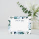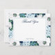 Uma nota floral moderna de agradecimento apresenta rosas de jardim brancos, hydrangea azul e folhas verdes em um fundo azul marinho. A tipografia elegante da escrita adiciona um toque elegante. A personalização aparece na parte inferior.
