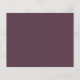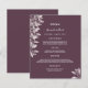 Um cartão de casamento elegante e moderno. Flores botânicas de cor rosa poeirenta, folhas. Modelos para seus nomes, data e menu de casamento. Um chic cassis, fundo cor roxa. Letras brancas coloridas. Traseira: fundo colorido do gabinete.