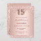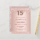 Um convite moderno, na moda e glamouroso para a Quinceañera, festa de aniversário 15. Um fundo rosa dourado com pingos, pintura pingada. O nome é escrito com um moderno e escuro, rosa dourado, escrito com letra de estilo manuscrito. Personalize e adicione os detalhes da sua festa. O número 15 é escrito com uma fonte de estilo balão, script.