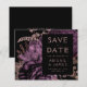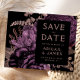 Este elegante e melancólico casamento Salve o cartão de Data apresenta um buquê floral romântico e luxuoso em roxo com folha de ouro rosa e folhagem brilhante num fundo preto. Personalize o texto de cor rosa em fontes na moda num retângulo preto e adicione o URL do site de casamento ao fundo preto sólido.