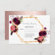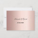 Um cartão RSVP elegante para um casamento com modelos para resposta por data, nomes etc. Penas e rosas de cor aquosa, flores em burgundy. Um falso quadro de ouro e branco. Um fundo branco na frente, texto preto. Nomes da noiva e do noivo, e a data do casamento. Um fundo rosa dourado. Texto preto.
