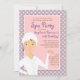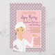 Uma menina marrom-eyed bonito está obtendo um manicure quando snuggled em sua veste branca do luxuoso por um dia de pampering nos termas. Uma grande ideia da festa de aniversário para adolescentes, 'adolescentes e formandos! No rosa pastel bonito e no roxo do lilac com bolinhas brancas.
