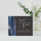 Este elegante orçamento salva a placa de data apresenta uma borda azul-marinho agate com cor d'água cortada com cintilação falsa de rosa. O texto personalizável combina o script de manuscrito rosa-rosa, as fontes em copperplate e itálico em um fundo preto de slate. O lado inverso apresenta um design agate correspondente.