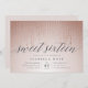 Um belo rosa dourado doce dezesseis convites apresenta um fundo branco cor-de-rosa com cordas verticais de luzes brilhantes de folha de rosa dourada. "Doce dezesseis" aparece por baixo na tipografia do script de caligrafia. Personalize com seus doces 16 detalhes de festas em cinzas elegantes.