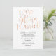 O Dreamy encontra-se rústico com este convite de casamento simples e elegante em ouro rosa. Adicione seu próprio texto à modelo abaixo do belo título do roteiro. Cartões correspondentes disponíveis ou entre em contato conosco para fazer uma peça personalizada!