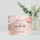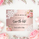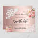 Um moderno e elegante Salve a Data para uma 50ª festa de aniversário. Um fundo rosa de gradiente dourado, decorado com flores cor-de-rosa e rendas brancas. Personalize e adicione uma data e um nome. O texto: Salvar a Data é gravado com um script de estilo com letra de tendência grande. 1 folha = 1 convite impresso de borda a borda.