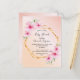 Um elegante convite para chá de fraldas de verão tropical. Com uma falsa estrutura geométrica de ouro decorada com hibisco de rosas claro, flores tropicais com um pouco de verde. Um fundo rosa dourado e cinza rosa-claro. O nome da mãe a ser está escrito com um moderno roteiro de estilo. Texto preto. Fundo: rosa dourado e plano de fundo rosa-claro. Sexo neutro ou celebração de uma menina. Dica: Se você não quiser que pareça um cartão postal, clique em personalizar, vá para o verso e remova o divisor e o carimbo de posto.