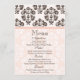 Personalize este cartão levemente afligido cor-de-rosa e marrom bonito do menu do casamento tema damasco da antiguidade do vintage com um fundo cor-de-rosa e branco do damasco e um design cor-de-rosa da fita com o que você estará servindo em seu dia especial. Projete o © Chrissy H. Estúdio, LLC. Todos os direitos reservados.