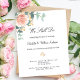 Um fundo branco chic. Decorados com ouro-rosa e folhas de eucalipto cor-de-rosa-esbranquiçada, flores de rosa e cor-de-rosa-esbranquiçada, galhos, verde-verde e um cinzeiro de ouro falso. Personalize e adicione seus nomes e detalhes. Letras pretas e verdes. 1 folha = 1 convite impresso de borda a borda.