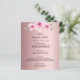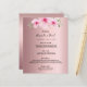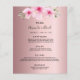 Um cartão de cardápio tropical elegante. Flores cor-de-rosa, flores hibiscos como decoração. Rosa dourado, rosa poeirento, fundo metálico de aparência falsa. Modelos para seus nomes, data e menu de casamento. Letras pretas coloridas.