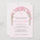 Um convite bonito para um evento comunista, batismo ou religioso apresenta uma lista de rosas cor-de-rosa e folhas verdes contra um fundo cor-de-rosa suave. Há duas pombas brancas na esteira e uma pequena cruz rosa.