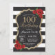 Rosa vermelha 100º Aniversário do Convite Dourado. Convidar Festa de aniversário preto e Dourado. Dourada Glitter. Black and White Stripes. Chalkboard. Digital Imprimível. Para mais personalização, clique no botão "Personalizar" e use nossa ferramenta de design para modificar este modelo.