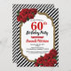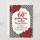 Qualquer idade. Todo texto é editável. Com rosas vermelhas elegantes, molho dourado e listras brancas e pretas elegantes. Convite de aniversário perfeito para mulheres / mulheres / mulheres / senhoras