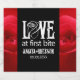 Celebrar o dia especial do tema gótico com estas marcantes etiquetas de vinho espumante, que apresentam o sentimento apimentado e cheio de trocadilhos, "Love at First Bite" em letras inspiradas no Gótico (e o esboço de um rosa, em pé para a letra 'O'), os nomes dos recém-casados e a data do casamento em prados negros e rosas vermelhas. Design © W.H. Sim. Mais informações em zazzle.com/expressionsoccasions