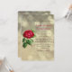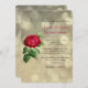 Um convite de casamento elegante e rico. O design é uma ilustração vintage de uma rosa vermelha florescente com folhas verdes. O fundo é um padrão mágico de ouro.