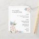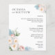 Menu de casamento elegante botânico chic com sotaque floral nos cantos apresentando seus nomes em negrito serifado elegante e um buquê de rosas e peônias brancas, azuis e rosadas em aquarelas suaves. Personalize com os detalhes do jantar de casamento abaixo.