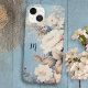 Leve antigas rosas brancas e flores silvestres em fundo azul-rústico. Campo de texto opcional para o seu monograma ou inicial.