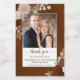 Estas etiquetas miniatura de vinho são perfeitas para serem usadas como favores de casamento ou como uma adição a um saco de permuta para membros da sua festa de noiva. O design apresenta sua foto cercada por rosas pintados manualmente de aquarela em tons de laranja ferrugem, número queimado e pêssego coral. A legenda diz: Obrigado por comemorar conosco, com os nomes do casal, a data do casamento e o tipo de vinho ou outro conteúdo de garrafa. O design floral rústico de aquarelas é perfeito para um outono ou um casamento de outono.